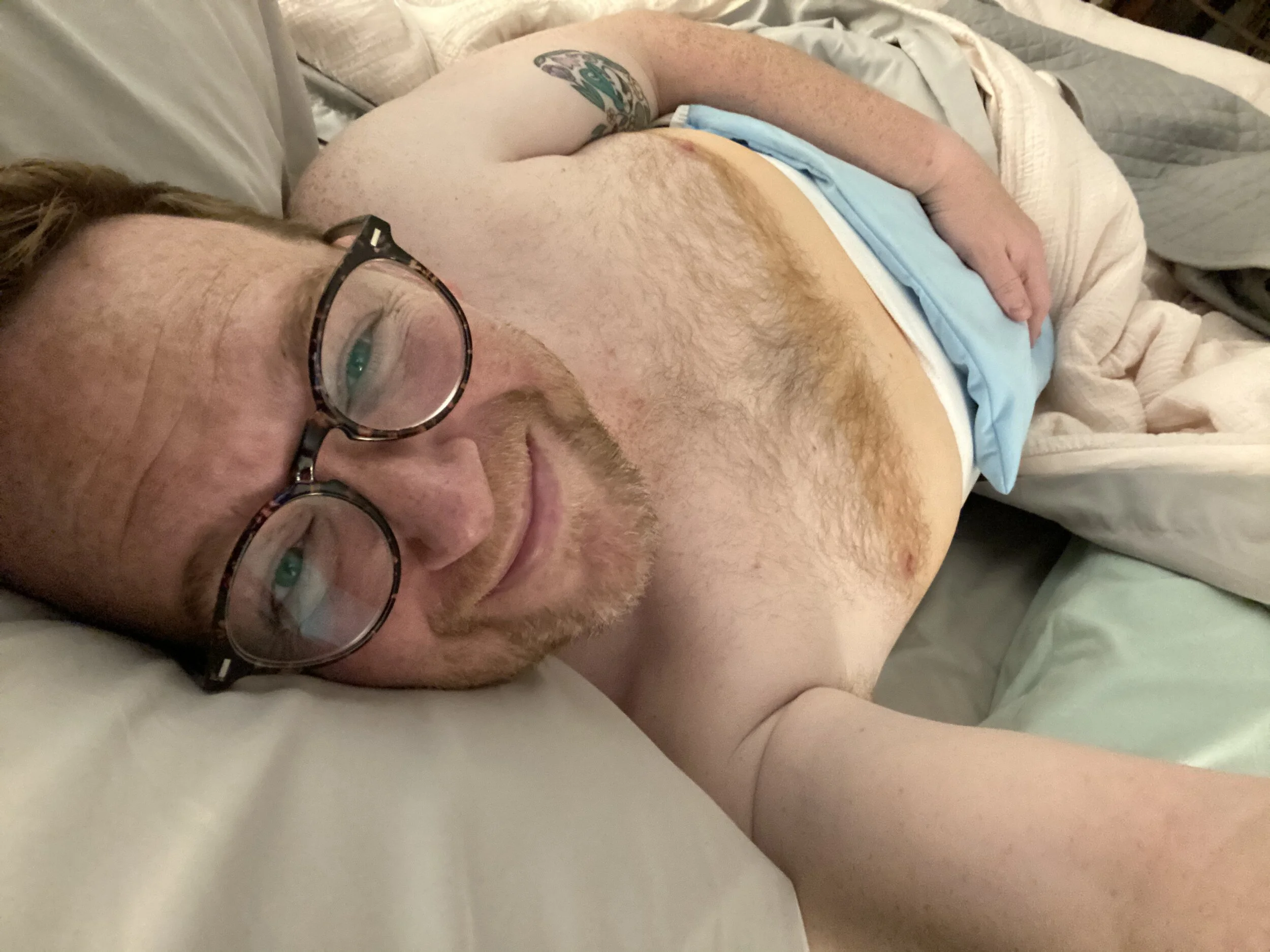 Last time I check in, I was pretty fresh out of the operating room. As I mentioned in that entry, post-op nausea was a major concern and, because of that, we approached sedation differently. I had a nerve block in my abdomen to cut down on the amount of sedation they gave me. It was a success; I had almost no nausea after the operation. What I didn’t anticipate was the abdominal cramping that hung around for a couple days after surgery. I spent a good amount of time like this: resting with a heat pad on my belly. It did wonders. Also…love that orange iodine line I’m sporting. It took so many showers to fully banish it.